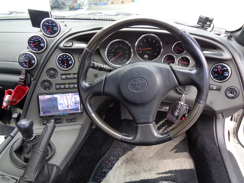 80スープラ特有の戦闘機のようなコックピットには油温計・油圧計・水温計・ブースト圧計・排気温度計が追加され、エアコンの送風口に追加メーターが埋め込まれています😍