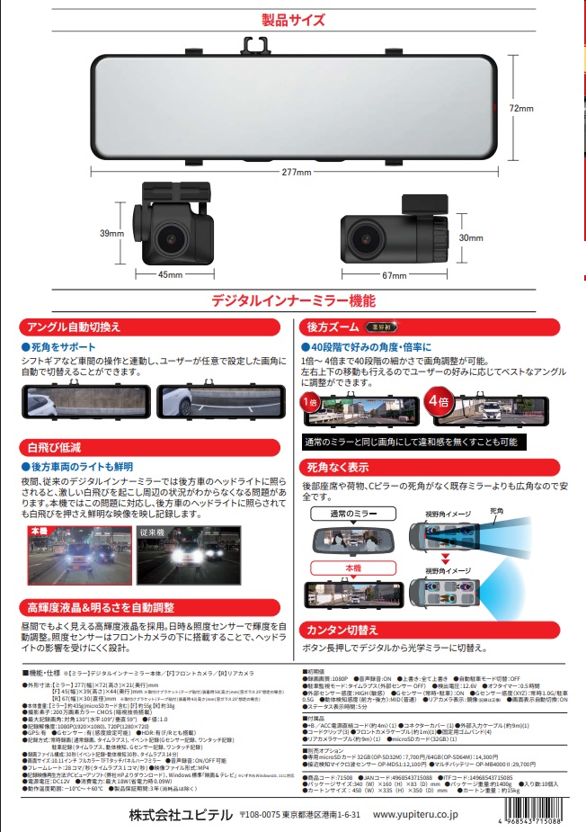 ユピテル社からデジタルインナーミラー型、前後2カメラ搭載型ドライブレコーダーが発売されます。
